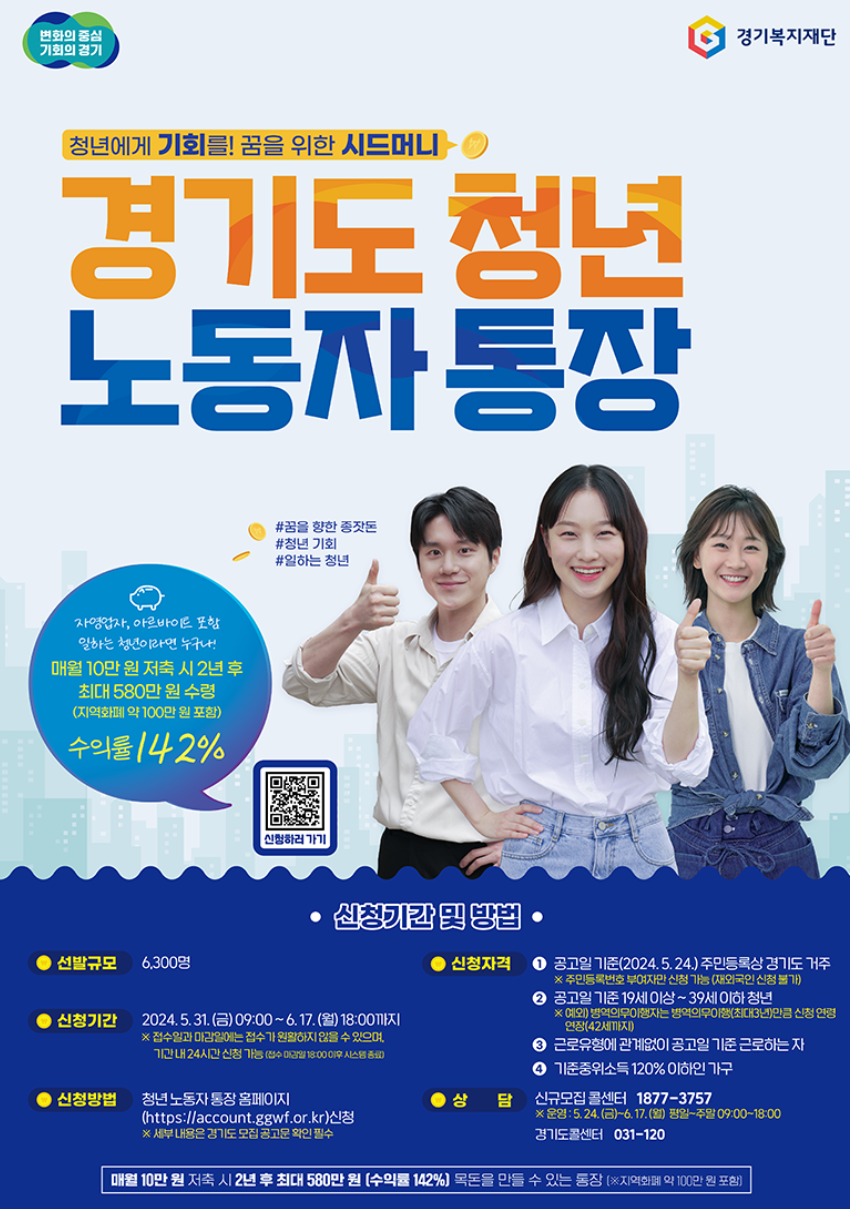 경기도 청년 노동자 통장은 경기도에 거주하며 기준중위소득 120% 이하인 청년이 매달 10만 원을 저축하면, 2년 후에는 경기도 예산으로 총 580만 원이 적립되는 통장입니다.